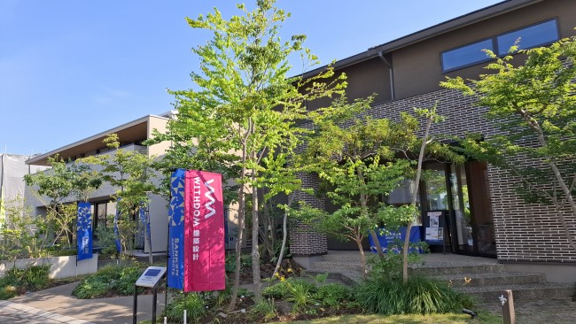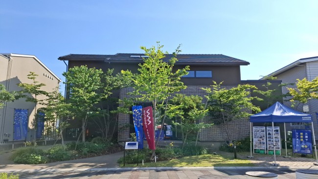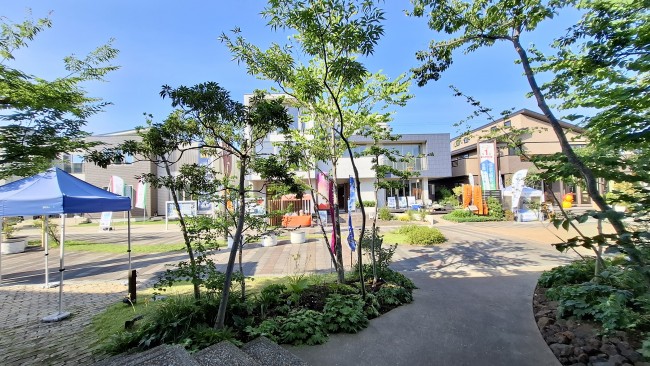 モデルハウスの玄関前から、外向きに眺めたお庭の様子。